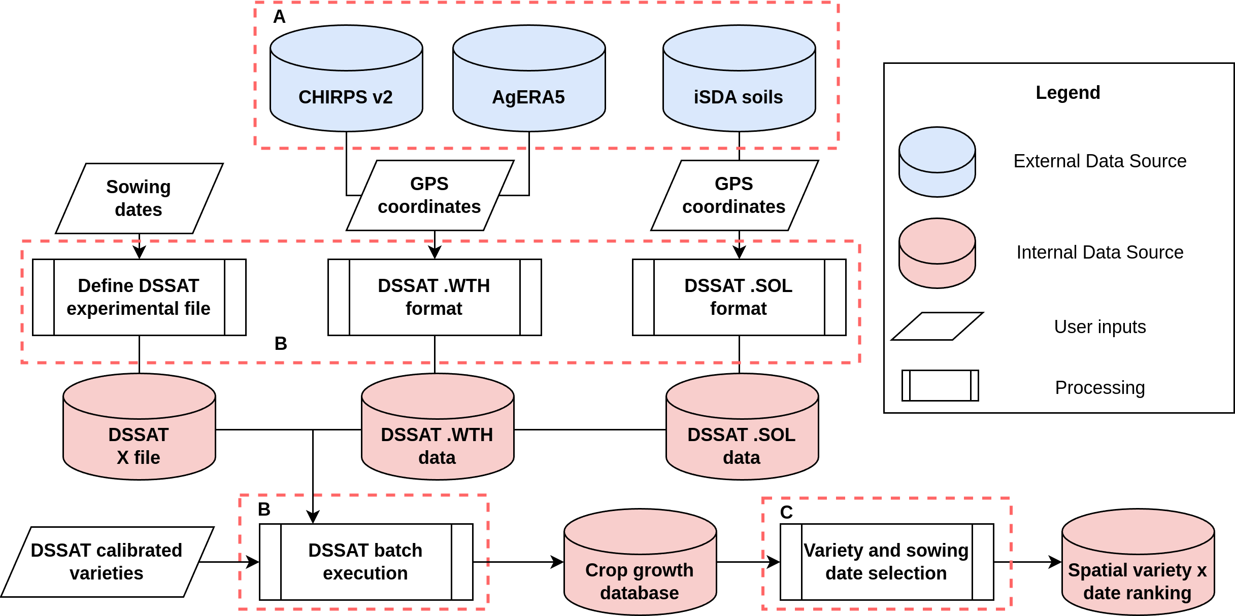Figure 1: General overview of the variety and planting window advice DST. Component A refers to the external data sources for the environmental data. Component B contains DSSAT related processes. Component C is the final step dealing with the aggregation and formatting of the final data outputs.